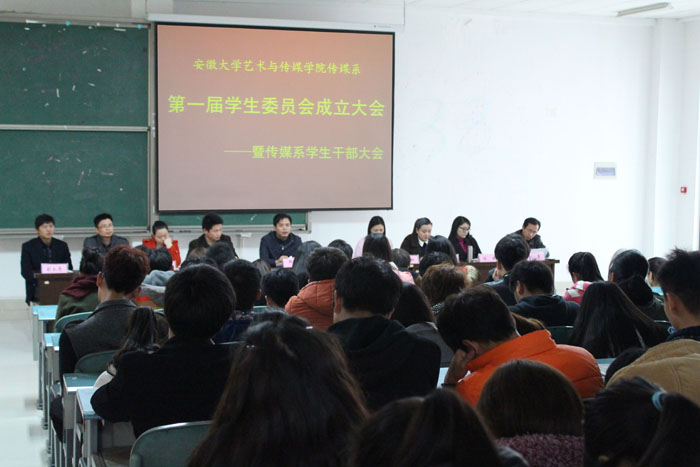 11月26日下午,传媒系第一届学生委员会成立大会暨传媒系学生干部大会在安徽大学艺术与传媒学院第三多媒体教室隆重举行。大会由刘勇老师主持,传媒系负责人韩大国教授、学院团委副书记陈明老师、传媒系主任助理吴梦东老师、传媒系教务与行政秘书李倩老师、传媒系老师刘永亮、陈娟、陈虹、刘彦东、薛如冰以及第一届学生委员会全体成员、各班级班干、入党积极分子、寝室长、寝室楼层长等参加了本次会议。大会在主持人刘勇老师致开幕词、介绍嘉宾后拉开了帷幕。