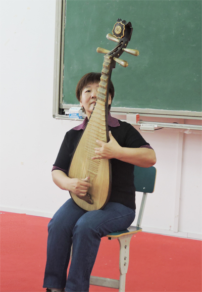 仪式结束后,潘教授为音乐舞蹈系全体师生作了题为《魅力琵琶》的学术报告会。潘教授细述了琵琶这一乐器的由来及其发展过程中形成的四个创作、演奏阶段,并结合古代诗人白居易的《琵琶行》来阐释琵琶演奏的技法特点。潘教授依次向在座师生展示了传统曲目《十面埋伏》《春江花月夜》,以及《伊犁的早霞》《井冈山上太阳红》等具有地方曲调特色的作品。虽然已是花甲高龄,潘教授的演奏,扫弦犹如骤风急挫、裂帛撕弦;轮指颗粒均匀,摇指缠绵回旋、细若游丝;音色时而柔中显刚,时而铿锵有力;而泛音则空灵、悠远,犹如天籁之音。