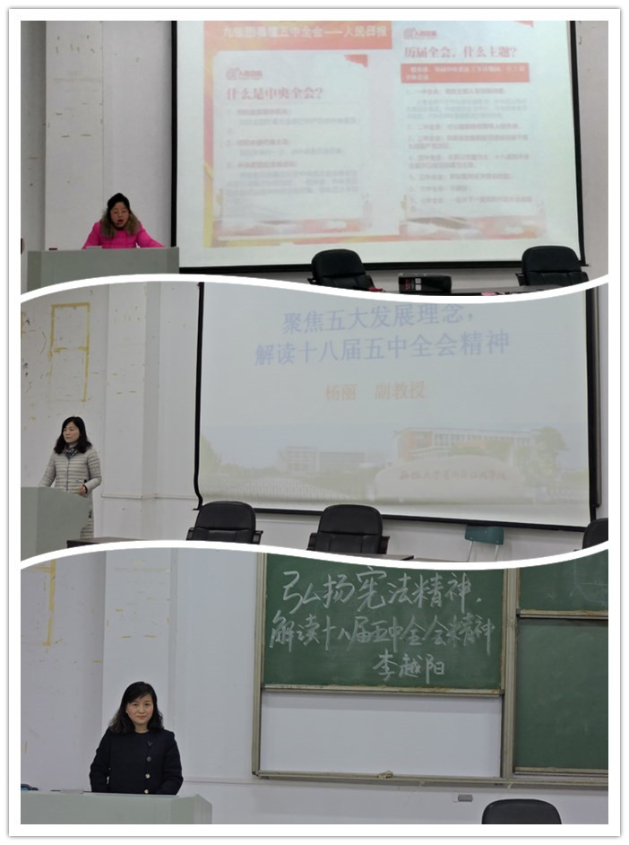 12月22日18至19点,陈昀岚老师为音乐舞蹈系与戏剧影视系学生做了题为《十八届五中全会精神解读》的讲座,从充分认识“十三五”时期的新变化新特征、准确把握“十三五”时期的新目标新理念、深刻领会“十三五”时期的新部署新举措、认真落实“十三五”时期的新任务新要求四个方面,解读十八届五中全会的系列亮点。