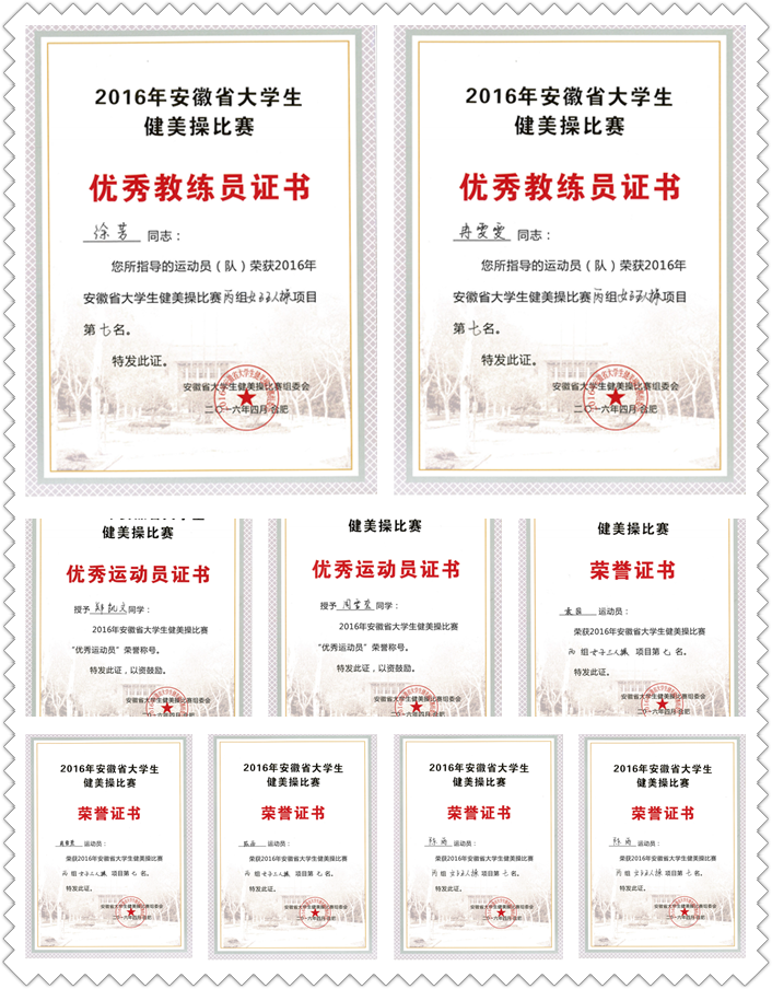 由安徽省教育厅举办的2016年安徽省大学生健美操比赛于2016年4月30日在安徽农业大学体育馆正式闭幕。本次比赛从4月24日到4月30日结束,全省41所高校参赛。我院代表队参加了甲组、丙组等4个项目的竞赛,其中专业组女子三人操、女子五人操均获得了第七名的良好成绩,徐芳、冉雯雯被评为优秀指导老师,学生郑凯文、汪雪纯被评为优秀运动员,我院代表队被评为道德风尚奖。