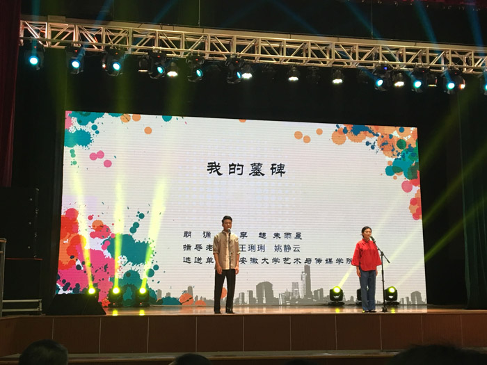 5月4日上午,决赛现场竞争异常激烈,然而李超、朱雨晨凭借出色的发挥,最终朗诵的作品《我的墓碑》以96.56分的高分荣获比赛的一等奖。由管汉青和沈冉合诵的作品《天路》和张琳莉朗诵的《姥姥,我想你》都分别荣获大赛三等奖。