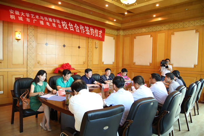 签约仪式上,桐城市副市长张支南对我院一行的到来表示热烈欢迎,他说,安徽大学艺术与传媒学院办学特色鲜明、学科优势明显,校台合作可以为广大学子提供学习实践的平台,也为广播电视台注入更多的新理念、新鲜血液,市政府会为校台合作提供大力支持,并希望有更长期的战略合作。吴茂松台长介绍了桐城广播电视台的历史发展与当前现状,并表示很高兴与安徽大学艺术与传媒学院建立合作关系,期待在人才培养、实习基地等方面有进一步的推进。