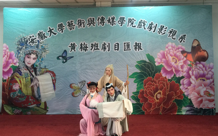 高阳当空照,清风送飒爽。在这六月的黄梅雨季,安徽大学艺术与传媒学院戏剧影视系2014黄梅本科班和2015黄梅专升本剧目汇报演出于2016年6月28日下午2点在一教二阶举行。院领导周之虎、张晶、郑善忠及各系部负责人到场观看。