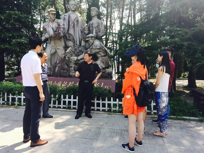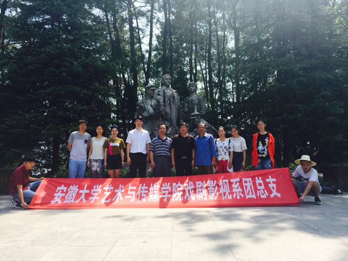 为了弘扬爱国主义精神,践行社会主义核心价值观,7月29日上午,大学生暑期“三下乡”社会实践团一行冒着酷暑来到大别山烈士陵园。上午十点左右,学院党委书记、院长周之虎和戏剧影视系党总支书记董兆和等领导不辞辛苦,专程赴大别山烈士陵园亲切看望大学生暑期“三下乡”社会实践团的老师和学生,同时也慰问了微电影《烛摇红》剧组。全体人员在革命英雄纪念碑前进行了庄严的三分钟默哀仪式,表达了对革命烈士的深切哀思。随后大家在纪念馆负责人的带领下井然有序地进入馆内参观。瞻仰先烈们锈迹斑斑的遗物,重温英雄们艰苦卓绝的斗争,同学们深受震撼,他们或默默凝望;或提笔留言;或拍照留念,各自以不同的方式表达着对先烈的敬仰之情。