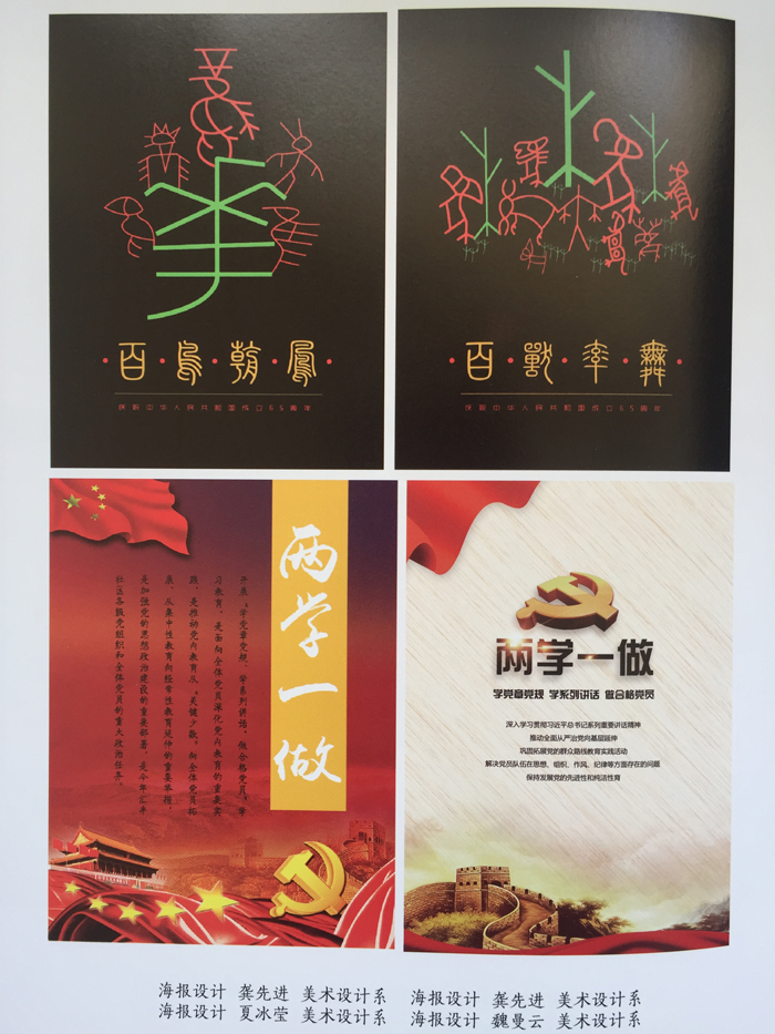 本次共展出设计类作品29件,以招贴、海报设计为主,紧扣[“两学一做”学习教育和庆国庆主题。作品有的与书法艺术结合,有的采用剪纸元素,有的运用敦煌壁画、民族舞形象,表现了绘画、体育、舞蹈等专业特色,传达了设计者对社会主义核心价值观和“两学一做”学习教育的深刻理解。作品风格新颖,构图精巧,图形图像设计富含创意,充分展示了我院师生扎实的专业功底、较高的创作能力和独有的艺术风貌,映透出他们教育事业的专注,对艺术学习的热爱,也说明我院人才培养质量在不断提升。值此安徽省第十次党代会召开和建国67周年之际,学院党委以此方式弘扬了中华传统文化,传承了民族精神,表达了我院师生对党和国家的热爱,对祖国繁荣昌盛,人民幸福安康的美好祝愿。(文/赵晨)