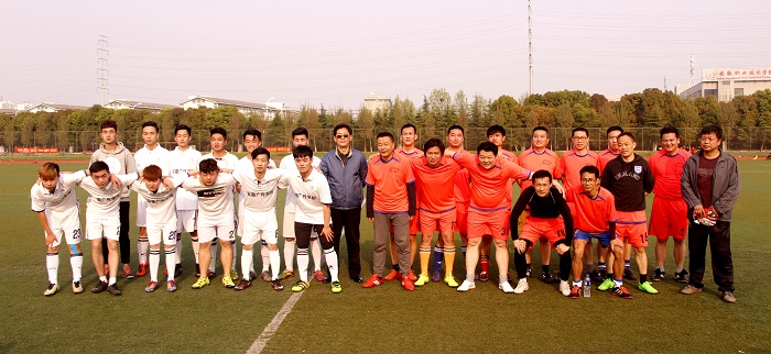 开幕式后,学院党委副书记沈端良亲切慰问教工联队、学生联队,并和大家合影留念。随后,沈书记在足球场开球点欣然为比赛开球。