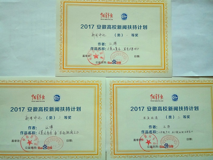 我院新闻播音系14级新闻采编与制作班汪博同学,在本次大会中,斩获多个奖项。由新闻播音系新闻学教研室王剑飞老师担任指导老师的三件获奖作品分别为:《黄山复名,真有必要吗》荣获新闻评论类一等奖;《莫让青春“毒”在起跑线上》荣获新闻评论类三等奖;《书暖庐州永不歇业的旧书店》荣获深度报道类三等奖。其中,深度报道《书暖庐州 永不歇业的旧书店》成功入选2017全国高校新闻扶持计划复赛。