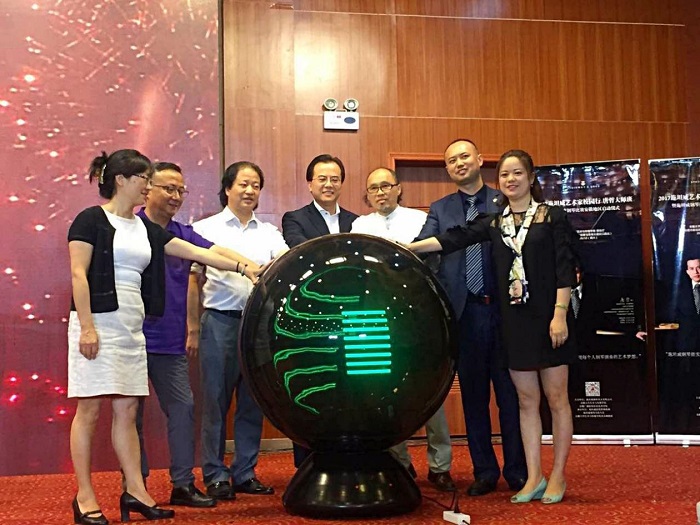 施坦威艺术家、上海音乐学院唐哲教授与安徽省文联副主席、安徽省音乐家协会主席盘龙等省音协嘉宾共同开启“第八届施坦威全国青少年钢琴安徽赛区比赛”启动仪式的水晶球。