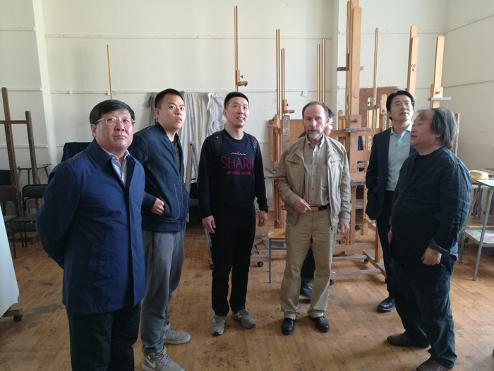 在俄罗斯国立师范大学,美术系主任弗拉基米尔.库茨米乔夫教授热情接待了访问团一行。经过商讨,双方在学生读研、教师进修访学、师生艺术交流、举办师生画展等方面达成合作交流意向。库茨米乔夫教授还陪同访问团一行参观了该系画室等教学场所。