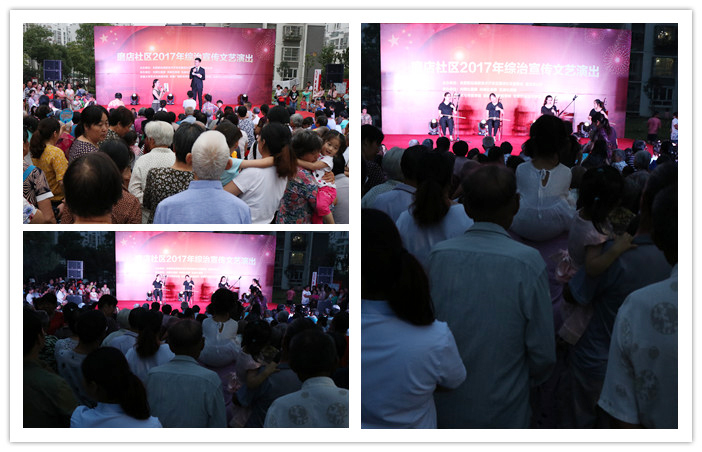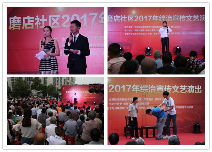6月14日--16日,磨店社区2017年综治宣传文艺演出分别在梦溪小镇、少荃家园、文忠苑三个社区进行。本次演出由我院发起,得到了合肥市新站高新技术开发区磨店社区管委会、磨店派出所、光明社居委、洪峰社居委、瓦庙社居委的大力支持。