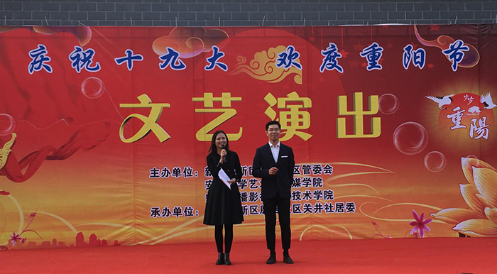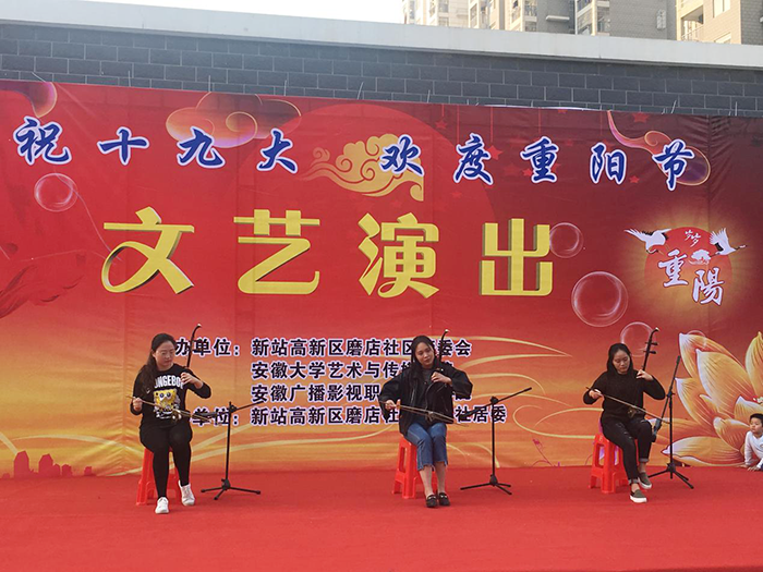 为庆祝党的十九大胜利召开,深入学习宣传贯彻十九大精神,展现新站高新区良好的发展面貌,引领艺术专业学生积极践行马克思主义文艺观,10月26日,学院和新站高新区磨店社区管委会联合举办了以“庆祝十九大 欢度重阳节”为主题的文艺演出活动。
