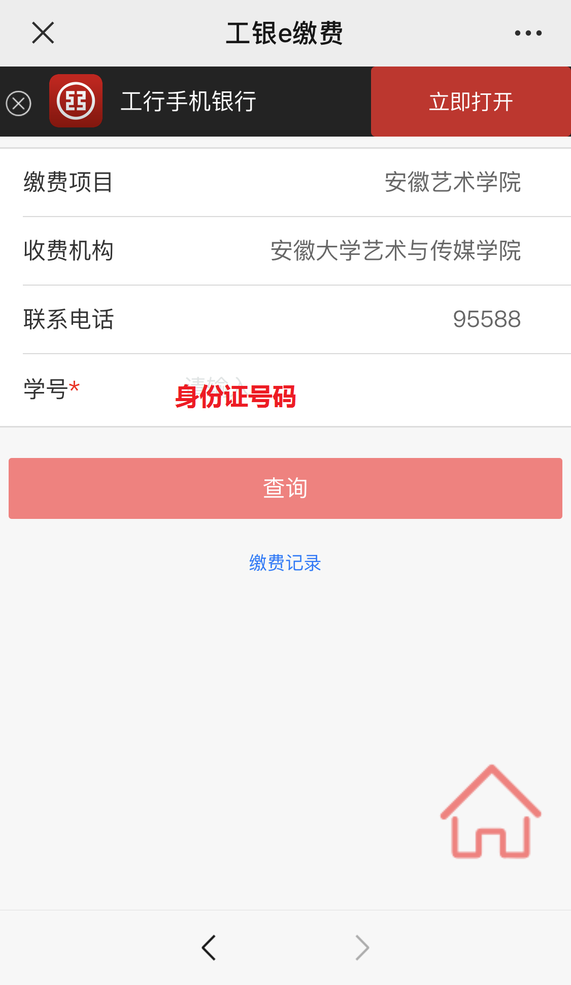 4.缴费项目选择安徽艺术学院,学号填写身份证号码,点击下一步。