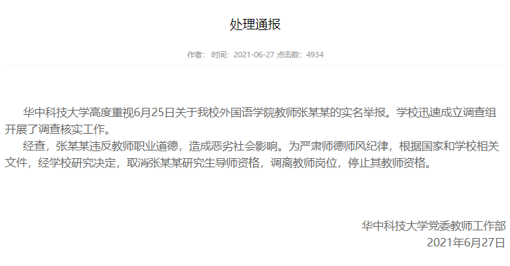 2021年6月27日,关于华中科技大学外国语学院教师张某某被实名举报一事已启动调查。华中科技大学官网发布《处理通报》,称经学校研究决定,取消张某某研究生导师资格,调离教师岗位,停止其教师资格。