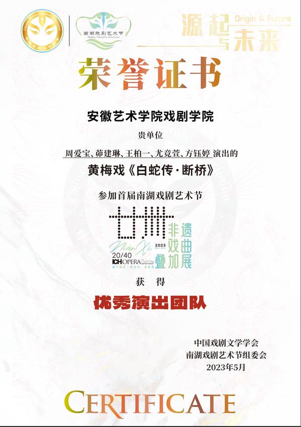 5月29日,2023南湖戏剧艺术节“廿卌非遗戏曲叠加展”评选结果揭晓,安徽艺术学院戏剧学院黄梅戏《白蛇传·断桥》团队荣获优秀演出团队奖。