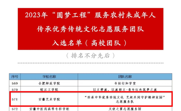 日前,由中央文明办三局、团中央青年志愿者行动指导中心、中国青年志愿者协会秘书处共同开展的2023年“圆梦工程”服务农村未成年人传承优秀传统文化志愿服务项目名单公布,我校“传承中国传统文化 艺起共同守护精神家园”志愿服务队成功入选。