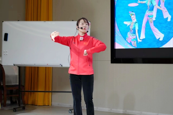 “一二三四,顺时针,转过去……”公共教育部徐丽主讲的《民族健身操》一开场的节奏就先声夺人,动作示范和指导充满韵律。民族风的华美服饰、配合举手投足间的京韵国风,课程着力铸牢中华民族共同体意识,思政元素如盐入水、自然融入。