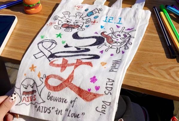 合肥市疾病预防控制中心的专业人员为师生们讲解和示范如何进行艾滋病病毒自测。学生志愿者们向大家发放防艾宣传读本及书签、科普小手册等相关物料。红丝带被同学们悉心地粘贴在每一只粉色气球上。一个个原本单调乏味的帆布包经过五彩缤纷的画笔描绘后,实现了色彩与灵感的碰撞,增进了同学们对艾滋病预防知识的了解。