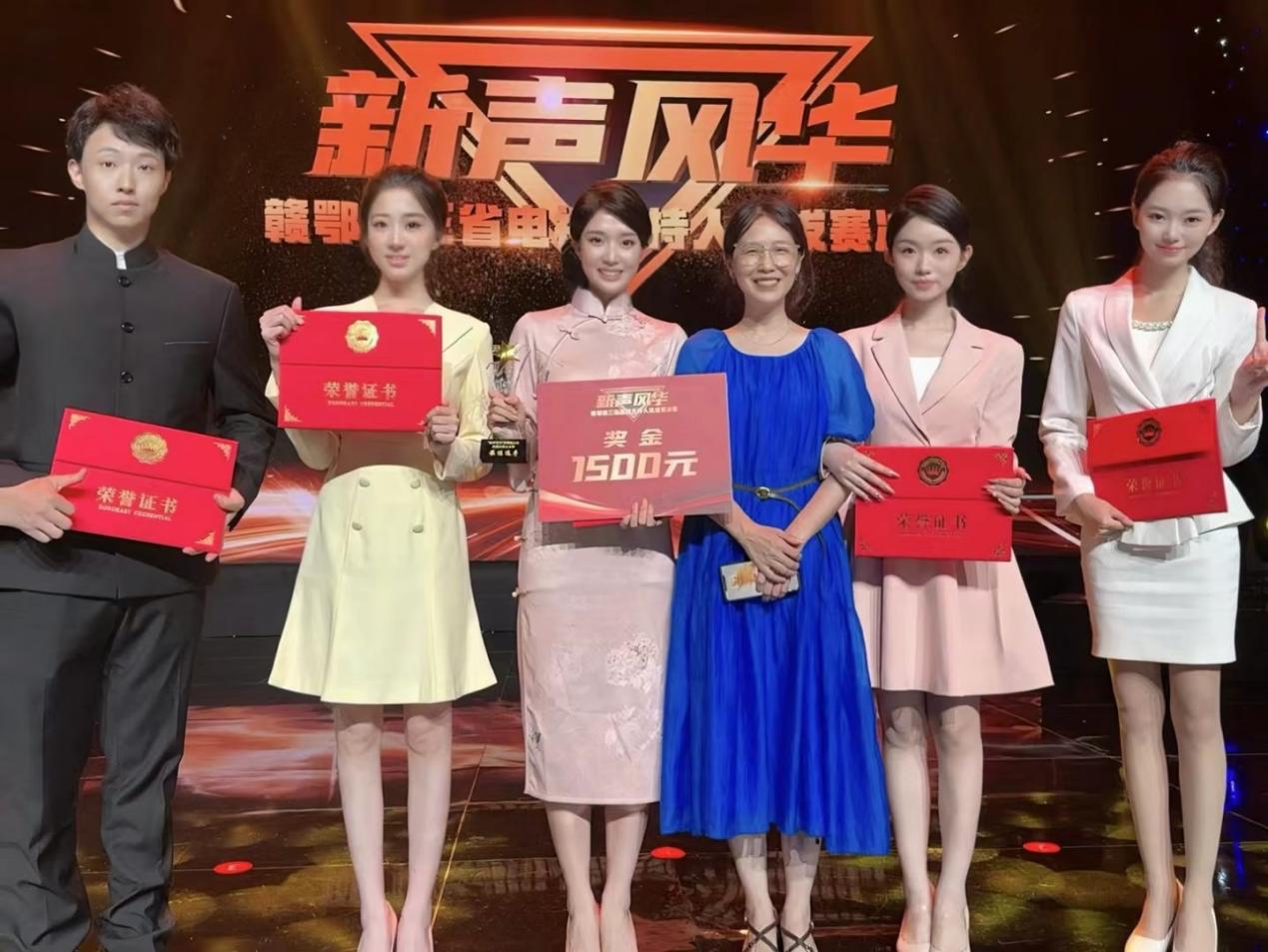 近日,“新声风华”赣鄂皖三省电视主持人选拔赛决赛暨文化采风活动在江西南昌圆满落幕。我校传媒学院学子在姚俊老师指导下喜获佳绩,21级播本2班张思萍脱颖而出,荣获最佳选手称号;21级播本2班揭胜、胡婧雨,21播本1班李文静,23播本2班高浙宁四位同学,共同获得优胜选手称号。