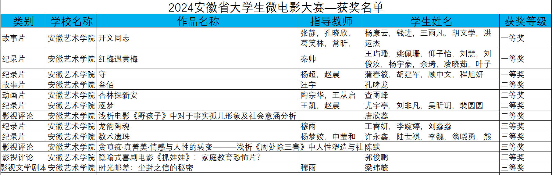 近日,由安徽省教育厅主办、安徽财经大学艺术学院承办的2024安徽省大学生微电影大赛圆满结束。安徽艺术学院学子在比赛中表现优异,共荣获三项一等奖,四项二等奖,五项三等奖。学校荣获“优秀组织奖”。