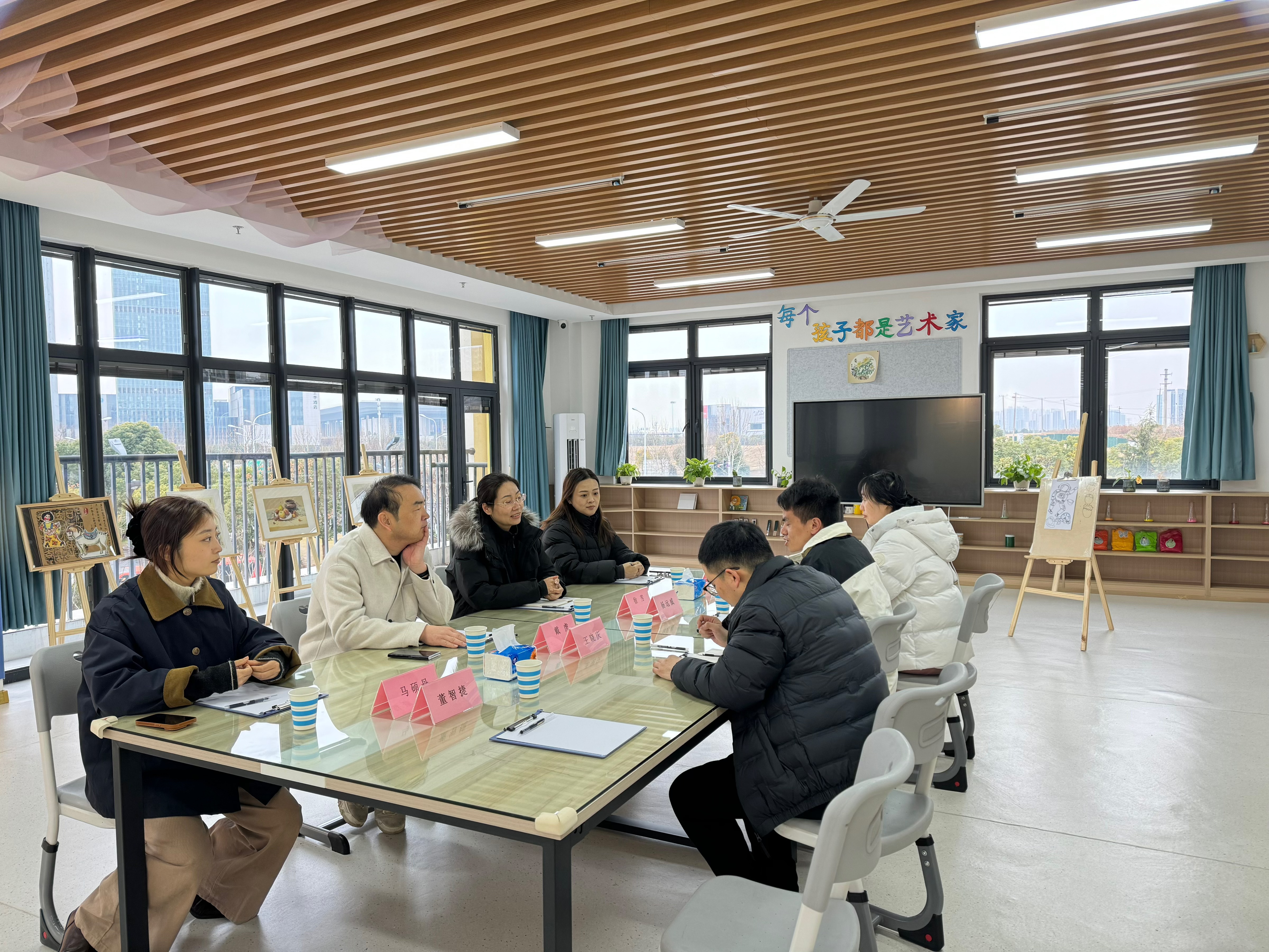 调研团队实地考察了童享美学堂教学环境,在运营总监王晓庆的引导下,重点观摩智能化教学设备运行,深入了解幼儿艺术教育创新理念。
