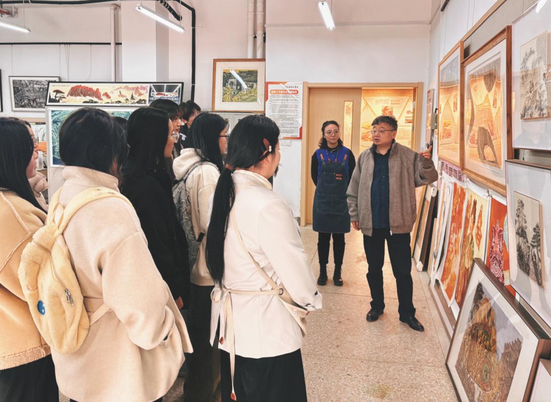日前,安徽艺术学院客座教授、中国美术家协会理事、安徽省美术家协会副主席、版画艺委会主任师晶到美术学院版画工作室指导学生毕业创作。