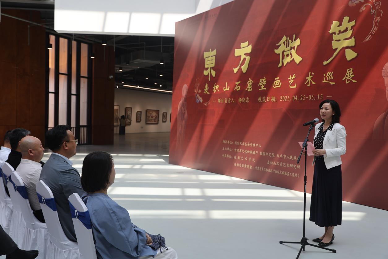 国家艺术基金2024年度传播交流推广项目“东方微笑——麦积山石窟壁画艺术巡展”近日在我校美术馆开幕。校党委委员、组织部长王琍琍出席开幕式并致辞,安徽省美术家协会、安徽省图书馆、安徽大学艺术学院、合肥师范学院美术与设计学院、安徽艺术职业学院等单位的领导、专家和我校师生300余人出席了开幕式。开幕式由美术学院院长束新水教授主持。