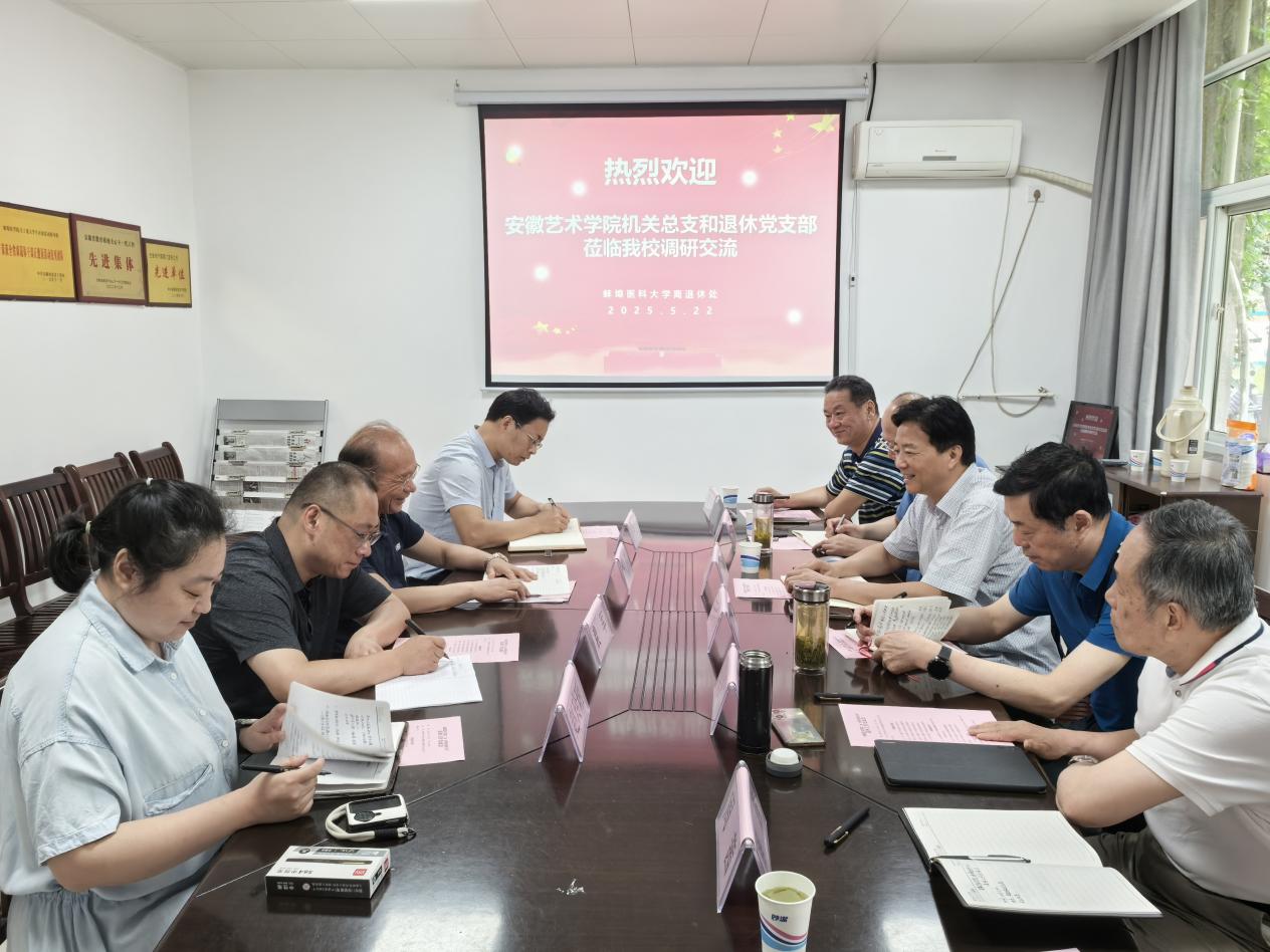 5月22日,机关党总支退休教职工党支部书记宣扬带队前往蚌埠医科大学调研。蚌埠医科大学离退休教职工党总支书记、离退休处处长麻利,离退休处副处长李中文以及相关科室负责同志参与座谈交流。