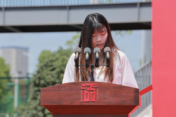 毕业典礼现场,来自美术学院2021级绘画专业的钱逸昕同学作为毕业生代表进行发言。钱逸昕讲述了自己在校学习期间的收获与感悟,并对学校的培养、老师们的指导表示感谢。
