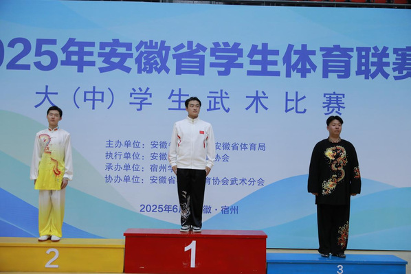 6月18日至22日,安徽省学生体育联赛大学生武术比赛在宿州市举行。本次比赛由安徽省教育厅、省体育局联合主办,宿州学院承办,吸引了全省各高校45个代表队,共245余名运动员参与。我校王秋实同学在男子甲组太极剑项目中获得第三名(二等奖)。