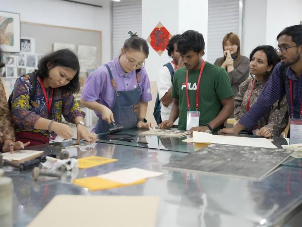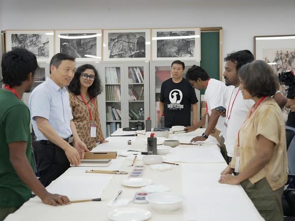 代表团成员们积极参与体验,亲手尝试了版画制作、中国画绘制和书法创作,切身感受了中国传统艺术的深厚底蕴。在参观过程中,代表团成员深入了解了安徽艺术学院在传统艺术传承与创新方面的成果,并对学院在专业建设、艺术教育方面取得的成就表示赞赏。