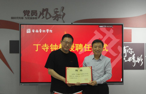 陈林宣读聘任文件,并为丁寺钟教授颁发聘书。他在致辞中指出,丁寺钟教授是我国著名的水彩画家,安徽省水彩画领域的领军人物,现任中国美术家协会水彩画艺术委员会副主任、安徽省美术家协会副主席、安徽省水彩画学会主席,享受安徽省政府特殊津贴。其作品曾获第二届“李剑晨奖”水彩画双年展金奖、第七届全国水彩粉画展银奖、第六届全国水彩粉画展铜奖等,多幅水彩画作品被中国美术馆等专业机构收藏。