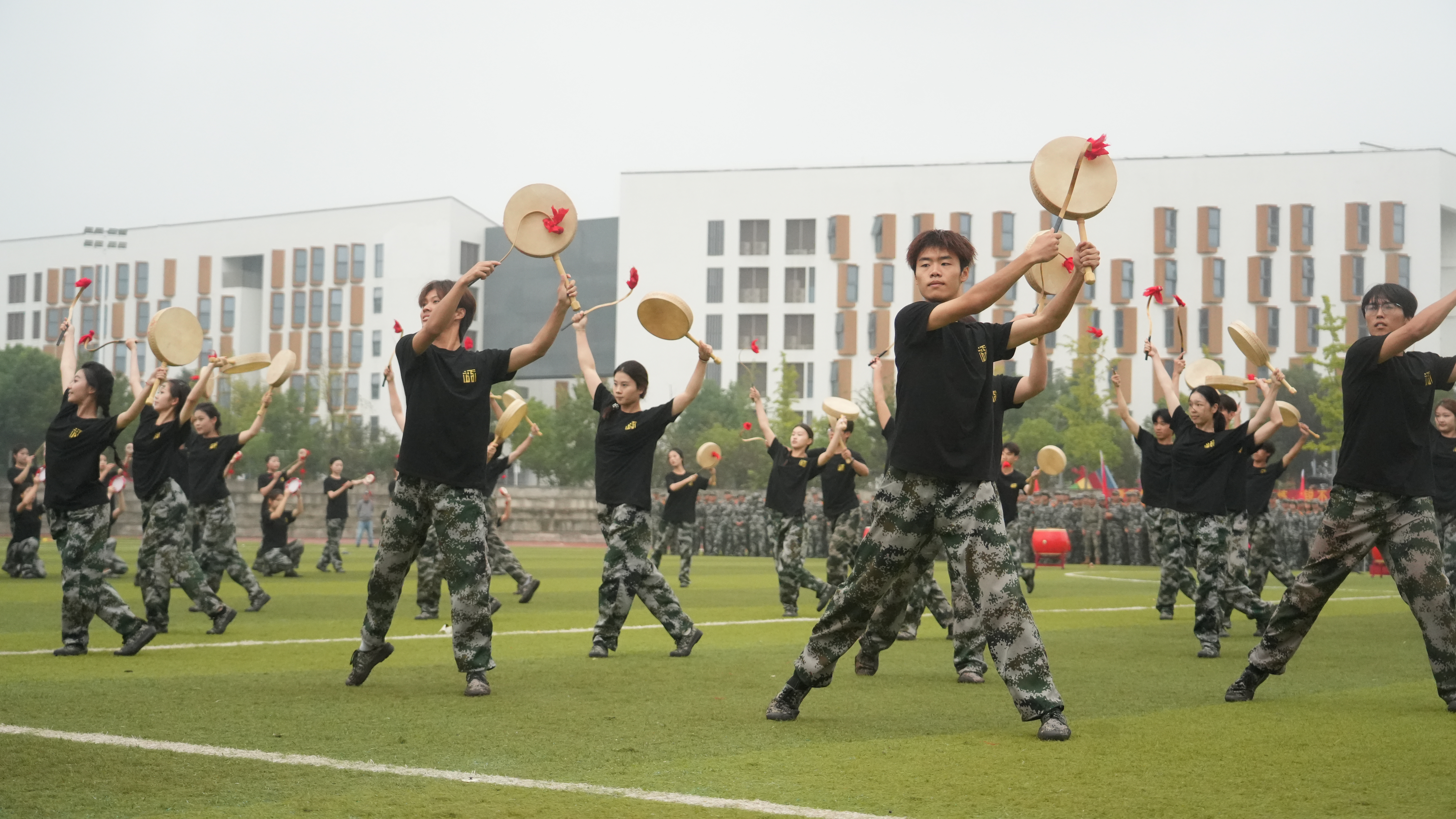 分列式结束后,军事科目与文艺汇报表演精彩上演。音乐学院师生倾情合唱《艺心向阳》《向往》,歌声铿锵有力又饱含热忱,以青春旋律传递我校艺术特色;女子匕首操方队出刀迅猛、踢腿刚劲,动作精准利落、气势如虹,展现“巾帼不让须眉”的飒爽;男子战术分队模拟真实战场,依托掩体快速跃进、协同搜索、交替掩护,动作敏捷、配合默契,凸显扎实战术基础;舞蹈学院群舞《鼓舞江淮》以鼓为魂、以舞传情,激昂鼓点搭配豪迈舞姿,生动展示青春力量。