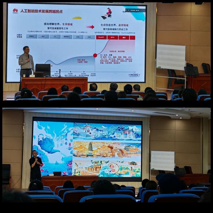 在主题宣讲环节,安徽广电AIGC实验室执行召集人陈小奇分析了AIGC技术的发展现状与应用前景,并现场演示了华为开发者平台的智能创作功能。中国动画学会委员宣兴磊则聚焦AIGC在数字创意与文旅融合中的实践,详细讲解了AIGC在文旅项目视觉开发、插画设计、海报及动画制作等领域的应用流程与创新成果。大赛组委会成员赵泉正式发布大赛主题,并就赛事关键信息进行详细解读。现场三位委员还就同学们关心的技术实现、创意构思及参赛流程等问题进行了细致解答,交流气氛热烈。(撰稿/摄影:李婷婷 初核:俞璋凌 编辑:张娜娜 审定:尹广富)