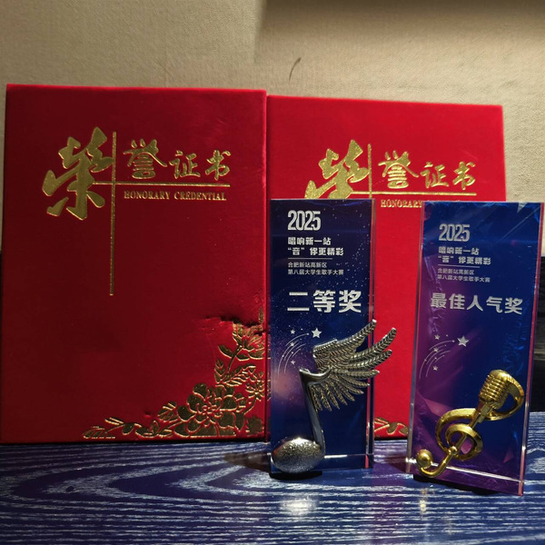 近日,合肥新站高新区第八届大学生歌手大赛总决赛圆满落幕。经过多轮激烈角逐,音乐学院2025级声乐一班刘力维同学发挥出色,最终荣获大赛亚军,并同时斩获大赛“最佳人气奖”,充分展现了音乐学院学生扎实的专业基础和良好的舞台风采。