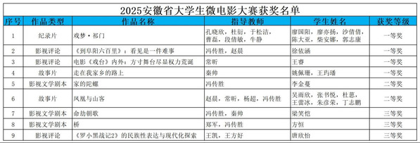 近日,由安徽省教育厅主办,安徽财经大学承办的2025年安徽省大学生微电影大赛评选结果揭晓。我校在此次比赛中表现优异,共荣获4项一等奖、2项二等奖、3项三等奖,同时有10位老师获得“优秀指导老师”称号。