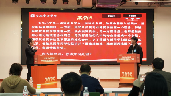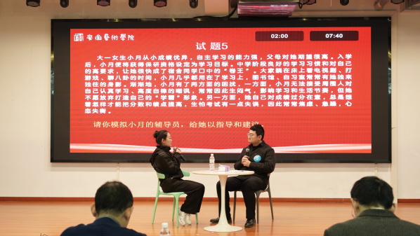 决赛阶段聚焦实战能力,分为案例研讨与谈心谈话两个模块。案例研讨环节紧扣学业困惑、危机应对、网络舆情、职业发展等真实工作场景,选手们精准把握问题关键,结合专业理论提出切实解决方案,充分体现分析研判与实务处置能力。谈心谈话环节通过情景模拟,真实再现辅导员日常工作中的典型沟通情境。面对学生演员呈现的思想波动与成长烦恼,参赛辅导员耐心倾听、共情引导,在温和而坚定的交流中化解心结、传递价值,生动展现了“一把钥匙开一把锁”的育人智慧,现场掌声不断。