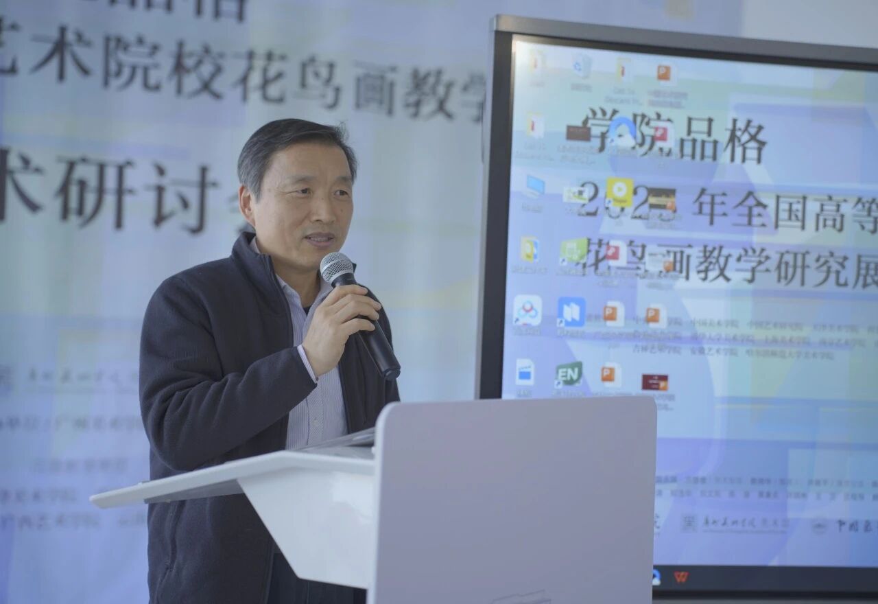 研讨会现场,陈林向与会院校介绍了安徽艺术学院的情况及办学特色,围绕花鸟画创作的变与不变阐述了当代花鸟画创作的思路、理念等,并结合安徽艺术学院美术学院中国画专业的教学,围绕当前花鸟画教学相关问题同参会院校师生展开了深入的研讨和交流。
