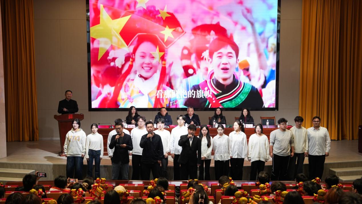 大会最后,学管办代表陈伟伟、淳于义龙,辅导员代表何刘涛,班主任代表孙阿楠与音乐学院二十余名学生共同合唱歌曲《向往》,以真挚饱满的情感表达对艺术理想的坚守与对未来的美好期许。表彰大会在热烈而温馨的氛围中圆满结束。