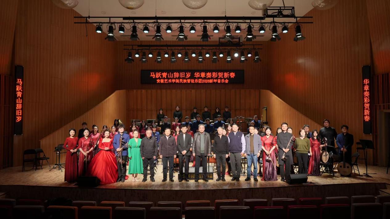 音乐会传国风、承国韵,在气势磅礴的《庆典序曲》中拉开帷幕,台上近70名师生用丝竹金石之声,回顾了2025年的辉煌和对新年的希冀,全场音乐会共13个作品,包含合奏、协奏、独奏、伴奏等形式,以安徽风格作品为特色,以歌颂祖国和人民为主旨,给师生带来节日的欢乐,营造祥和氛围,获得全场阵阵掌声及喝彩。音乐会在热烈欢快的返场作品《花好月圆》中落下帷幕。