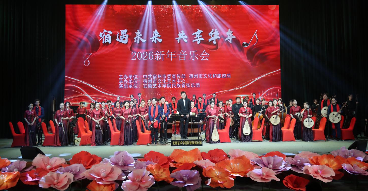 12月30日晚,由中共宿州市委宣传部、宿州市文化和旅游局主办,宿州市文化艺术中心承办的“宿遇未来 共享华年”2026新年音乐会在宿州市文化艺术中心大剧院上演。我校民族管弦乐团受邀参演,以一场水准精湛、情感真挚的民乐盛宴,与现场八百余名社会各界观众共迎新年,奏响了祝福宿州、展望未来的华美乐章。