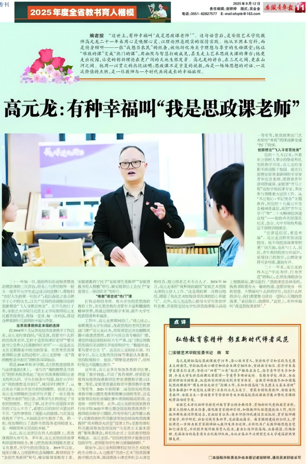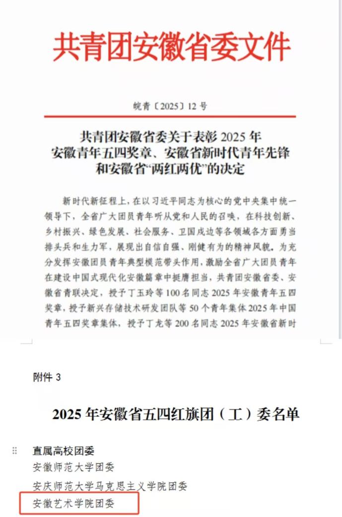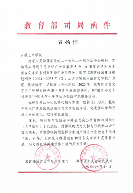 “‘艺’讲思政”品牌持续擦亮,连续第五年打造全省“艺术思政大课”,斩获安徽省教学成果特等奖1项。思政读本《“艺”话皖美》影响广泛,学生在安徽省大学生讲思政课比赛中4次蝉联特等奖。