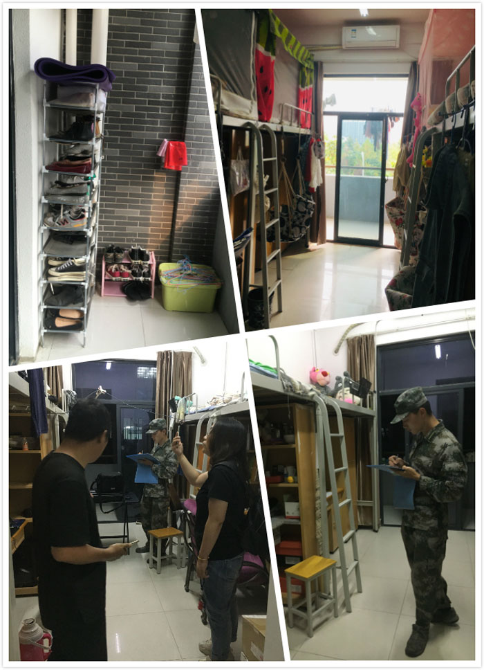 检查组由教官、辅导员及学生处工作人员组成,共分三组。按照军训评比细则,检查组深入参训学生寝室,重点检查被子叠放、桌面清洁、洗漱用品的摆放等情况。本次寝室内务检查走进近200间学生寝室,最终选出优秀内务寝室18间。从检查情况看,获得优秀内务寝室整体卫生良好,门口无垃圾,卫生间、阳台整齐干净,行李箱、专业器材定点摆放整齐,无隔空乱拉绳索、电线、网线,无违规电器现象,并张贴寝室长和值班名单,宿舍氛围和谐活泼。