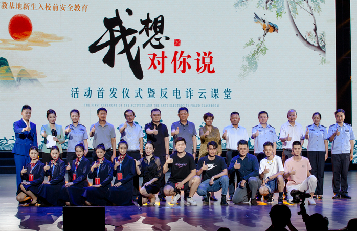 新生开学季,安全第一课。8月28日上午,新站高新区高教基地新生入校前安全教育“我想对你说”活动首发仪式暨反电诈云课堂在我校小剧场拉开帷幕。合肥市委政法委副书记俞道忠参加启动仪式。本次活动由新站高新区政法办公室、新站公安分局主办,区党工委办公室、社会事业局、磨店社区、市公安局磨店派出所协办,安徽艺术学院、高教基地高校平安联盟承办。除参加现场活动的150余名同学外,同时有10万余名大学生线上观看“云课堂”。