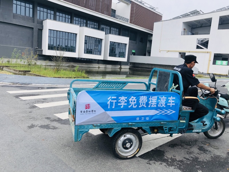 校内,教工车辆一律从西门进入。新生陆续报到,门岗防疫执勤人员热情又严格地执行防疫工作程序。下雨天,安保人员仍坚守岗位,组织新生有序入校。新生宿舍离校园北门较远,保安人员利用警务四驱车、三轮车、小货车作为新生的行李免费摆渡车,无论骄阳还是雨天,不辞辛苦地免费帮新生摆渡行李,深得师生、家长的赞同。