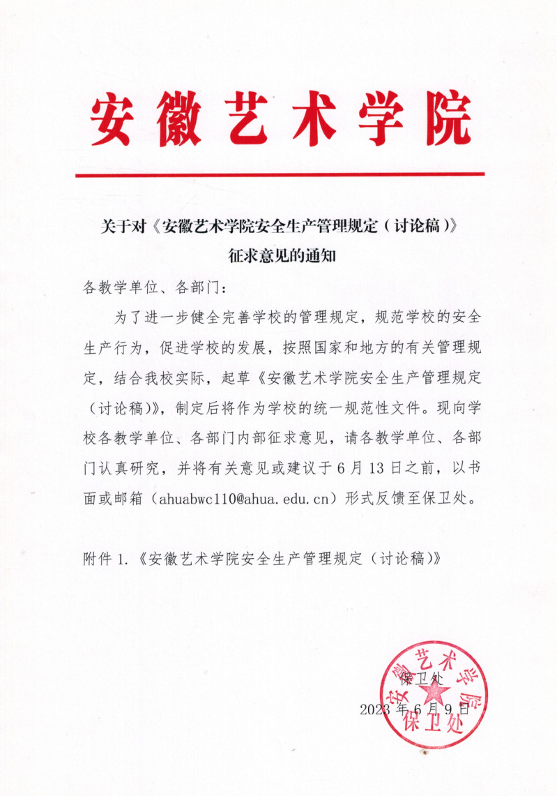 关于对《安徽艺术学院安全生产管理规定(讨论稿)》征求意见的通知
