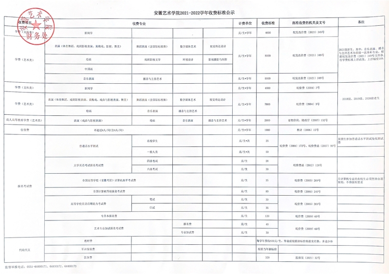 安徽艺术学院2021-2022学年收费标准公示