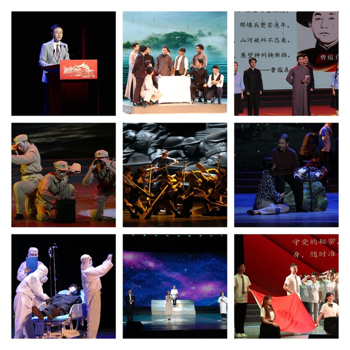 本次艺术思政课共分七个章节,主讲人由新闻播音系教师尹广富担任。第一章“红船起航开天地”主要讲述“红船精神”,情景表演《红船》再现党的一大在南湖召开的情景,12名一大代表扮演者一一呈现《党的一大纲领》《共产党宣言》《国际歌》,令人振奋。