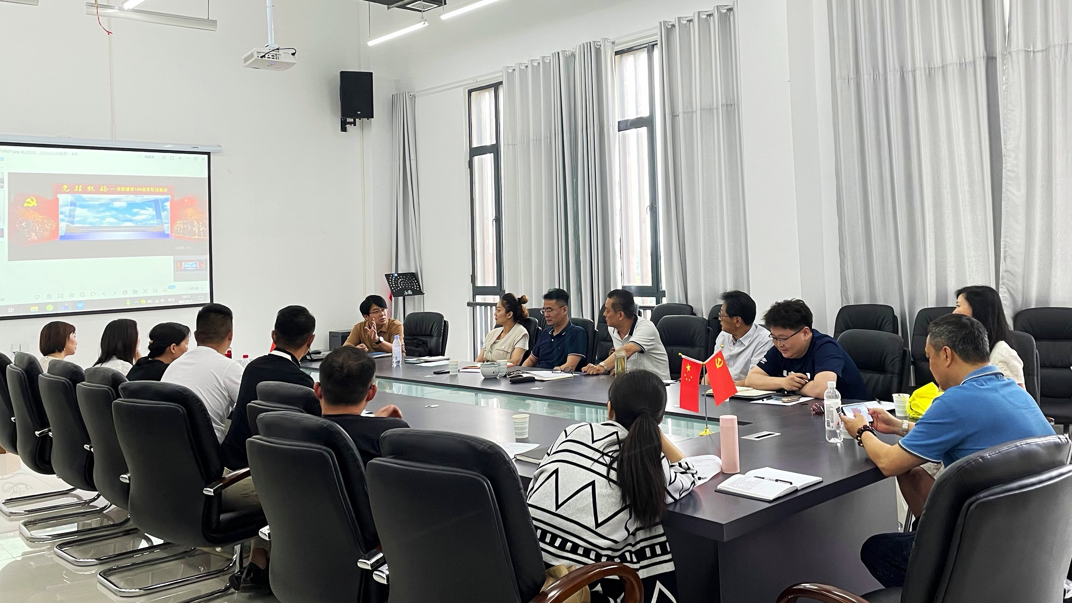 6月1日下午,庆祝建党100周年大型音乐舞蹈史诗“党旗飘扬”第二次创演推进会在舞蹈楼四楼会议室召开。校党务负责人沈端良,“党旗飘扬”创演、编导团队及相关工作人员参会。会议由音乐舞蹈系党总支书记、主任孙来法主持。