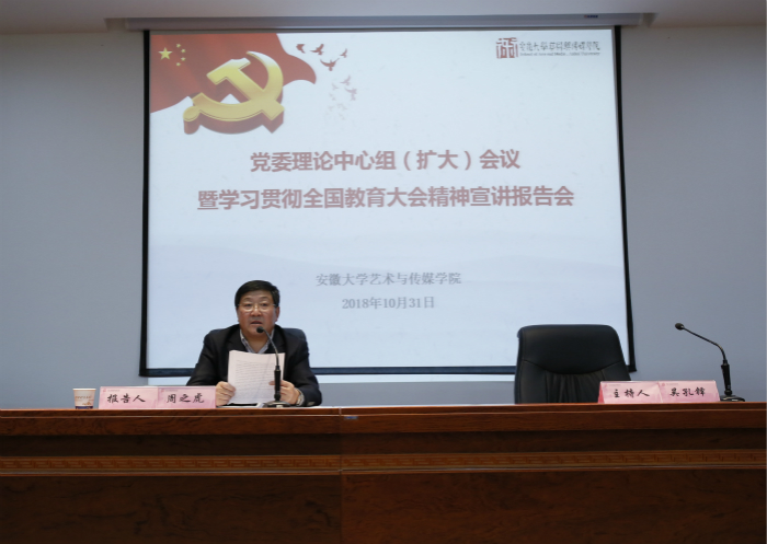 10月31日,我院在美术楼学术报告厅召开党委理论学习中心组(扩大)会议暨学习贯彻全国教育大会精神宣讲报告会。省全国教育大会精神宣讲团成员、学院党委书记、校长周之虎作学院首场全国教育大会精神专题宣讲。会议由学院党委宣传部部长吴孔铎主持。