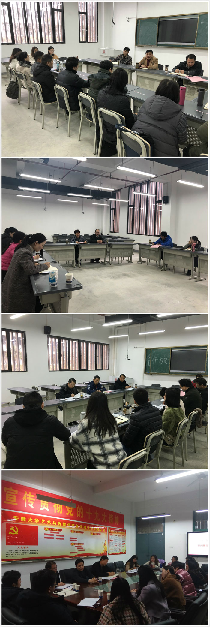 按照第三届教学学术研讨会议程安排,12月19日下午各教学系、公共教学部组织教师围绕贯彻落实全国教育大会精神、《安徽大学艺术与传媒学院振兴本科教育实施方案》、张建华副院长在教学学术研讨会上的报告及学院工作等议题开展分组讨论。学院党委书记、院长周之虎,副院长张晶、程世锁、张建华等分别到工作所联系的系部参加讨论。